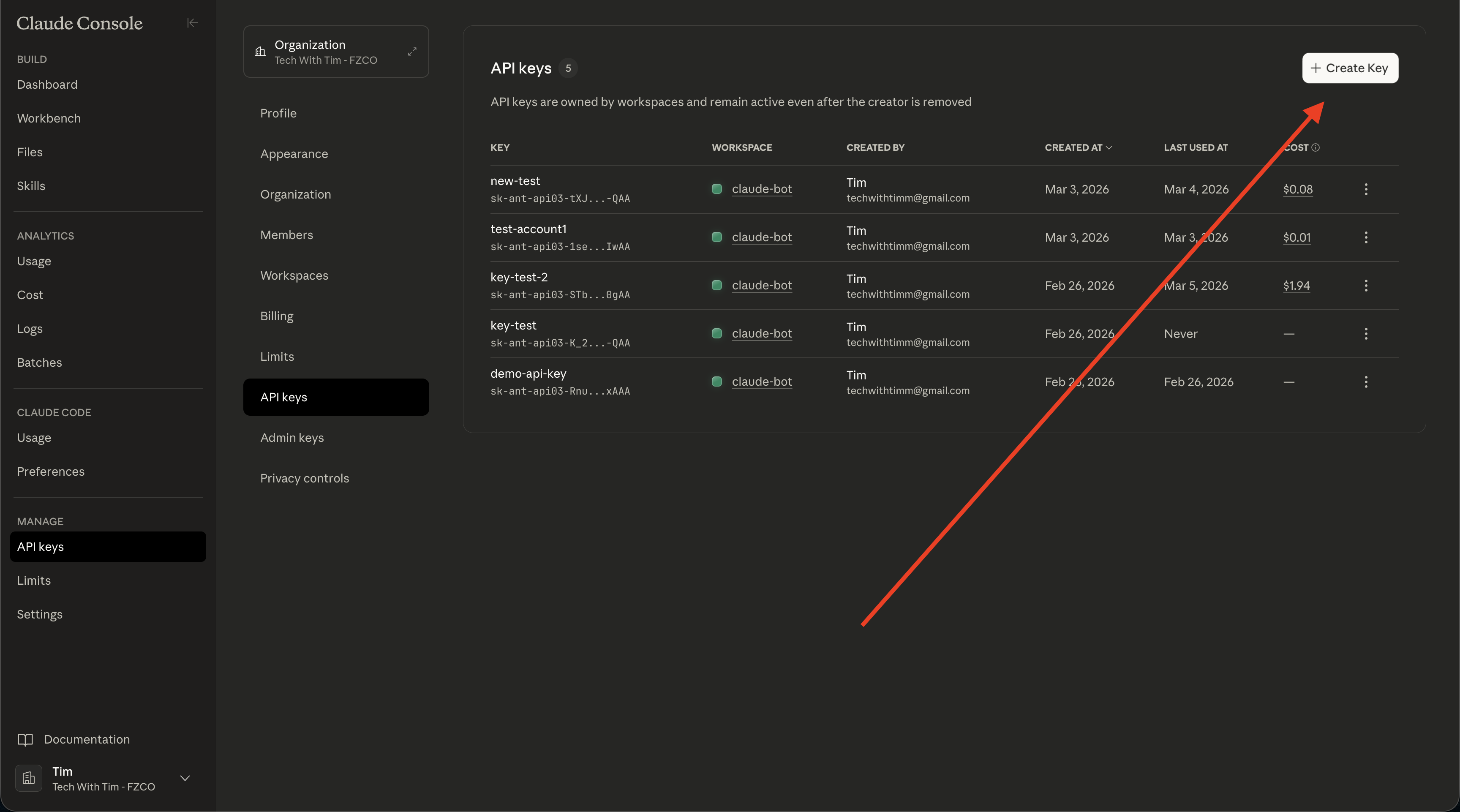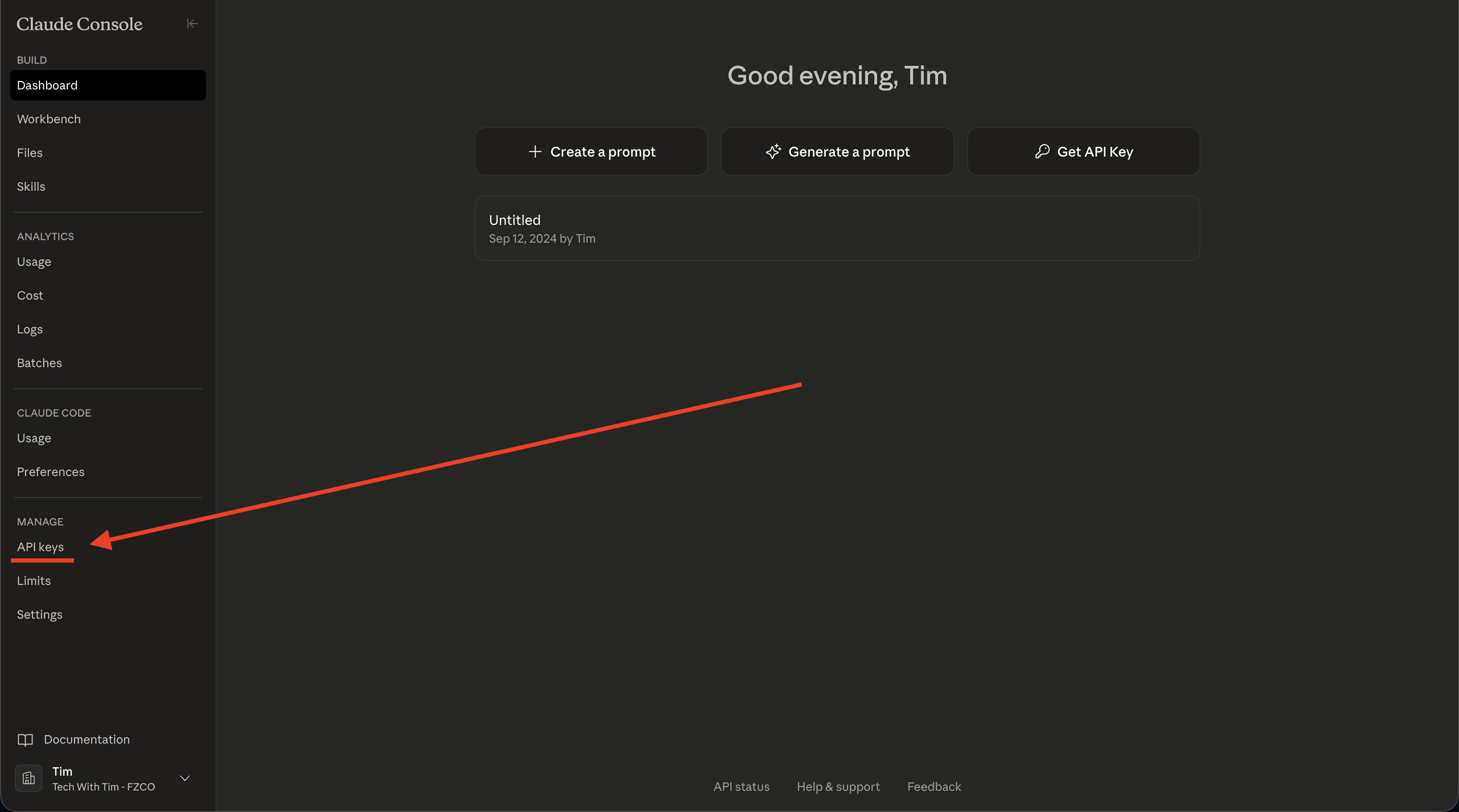 In the left sidebar, click API Keys (under your account/settings). If you don’t see it, look for Settings or Developers first.