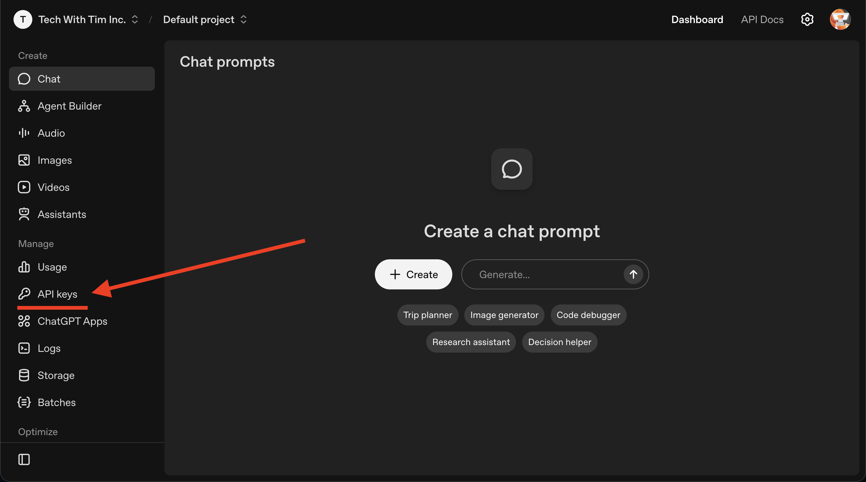 In the left sidebar, click API keys (under your profile/settings). Or go to platform.openai.com/api-keys.