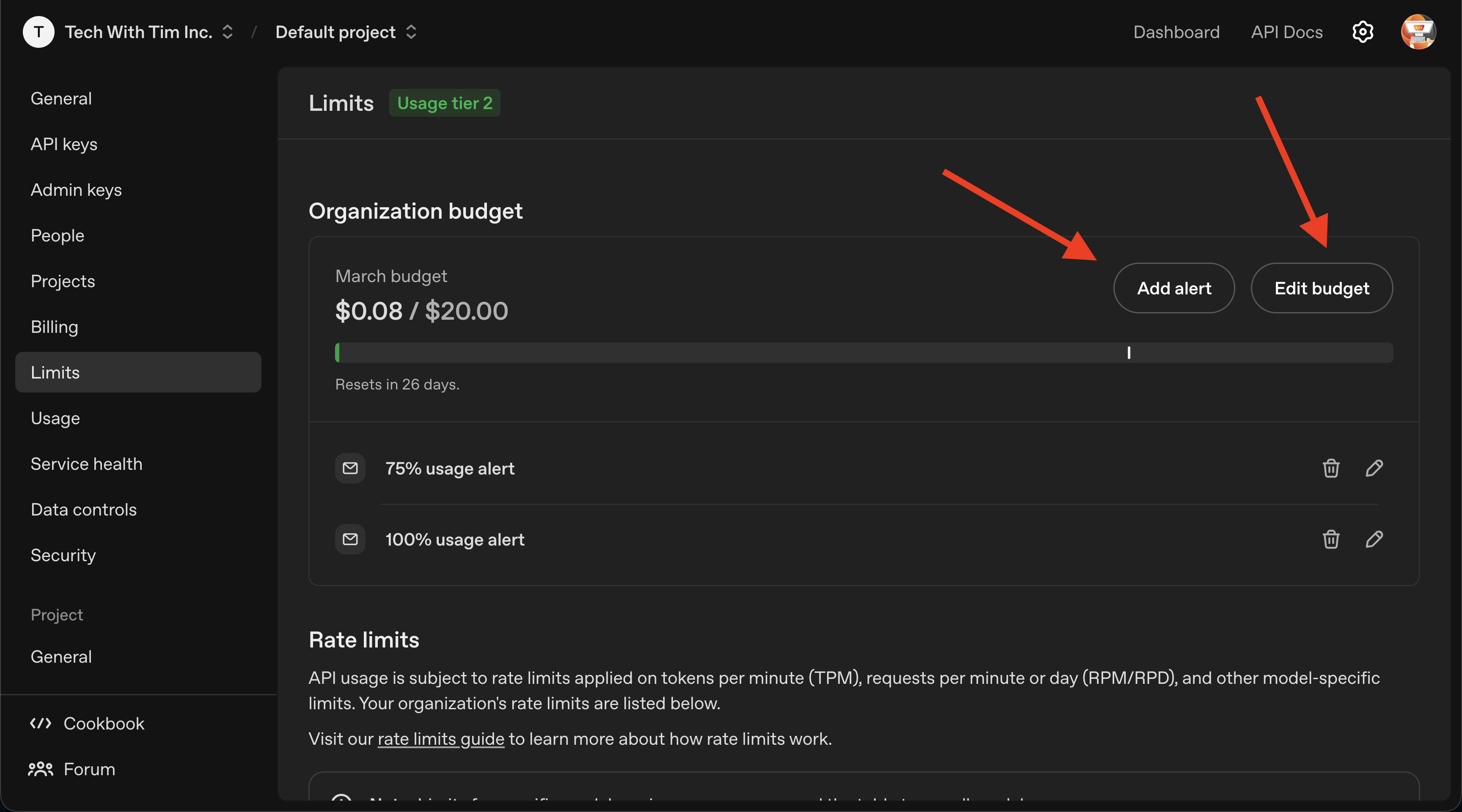 Go to Settings → Billing → Limits (or Usage limits). Set a monthly budget and/or hard limit so you don’t get unexpected charges. For a new integration, start with a low cap (e.g. $10–20/month) and increase it later if needed.